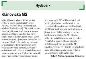 „V dubnu pan ředitel Žák předložil vzdání se funkce ředitele MŠ k 31.7.2018 a tato informace je k nalezení v publikovaných zápisech z rady. Vzápětí byl vyhlášen konkurs – opět zápisech RMČ. Výběrová komise zasedala dvakrát a zvolila 8.6. Danu Radinovou novou ředitelkou. RMČ ji 15.6. jmenovala do funkce. Zápis z 15.6. pan tajemník vyvěsí hned jakmile bude ověřen a podepsán.“ uvedla Ing. Martinová, zástupkyně starosty MČ Praha – Klánovice.