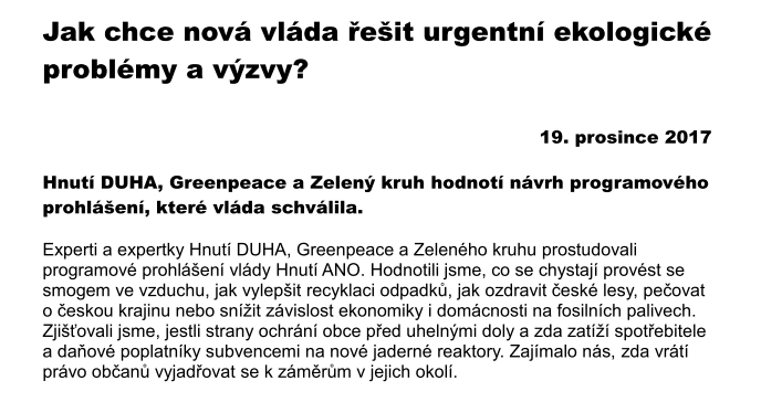 Ekologické hodnocení návrhu programového prohlášení Babišovy vlády