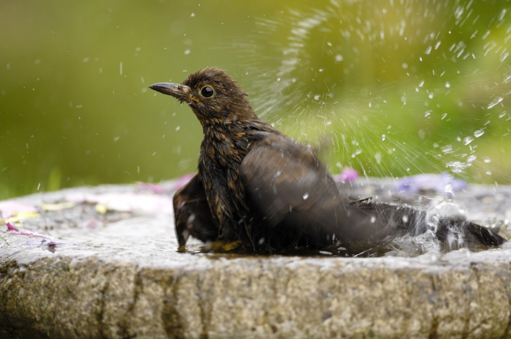 Blackbird Turdus merula, juvenile bathing in garden bird bath. Co. Durham. August. DOPORUČUJEME, OBČANSKÁ SPOLEČNOST, TÉMA, Udržitelnost9.7.2021