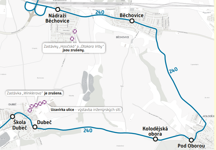 Přečtu si240 Linka jede z Dubče do Běchovic odklonem přes Koloděje (obousměrně) Ruší se zastávky: Winklerova…