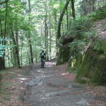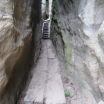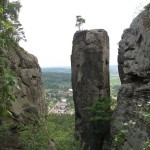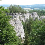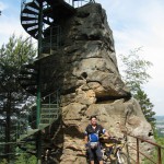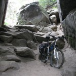 Za Srbskem jsme se zase “vnořili” do lesa a rozmanitými skalními útvary a průlezy pokračovali až k Drábským světničkám, kde byl plánovaný cíl cesty. Nečekaný problém vyvstal ve skutečnosti, že dostat se z Drábských Světniček s bicyklem škvírami mezi skalami zpět do civilizace bylo místy skoro nemožné. Nicméně nakonec jsme se z toho kamenného bludiště vyplandali.