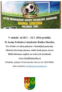 V Kolodějích letos podruhé probíhá prázdninová fotbalová škola „Letní brankářské kempy fotbalové akademie Radka Sňozíka“. Pro děti z Koloděj poskytuje MČ Praha – Koloděje výhodnou nabídku pro termín od 20. do 24.7.2016 Všechny info na plakátech níže, nebo na http://www.faradkasnozika.cz/