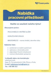 nabídky pracovních příležitostí v podniku Česká pošta, zveřejněné na webu města, najdete též pod článkem;