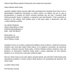 problémy s Českou poštou eskalují, vedení města je identifikuje nikoli jako personální, ale jako systémové, a špatnou službu, kterou Česká pošta poskytuje občanům a Městu Úvaly bude vedení města řešit na Generálním ředitelství, případně na Ministerstvu vnitra – sdělení České pošty a komentář starosty Boreckého z webu města najdete pod článkem;
