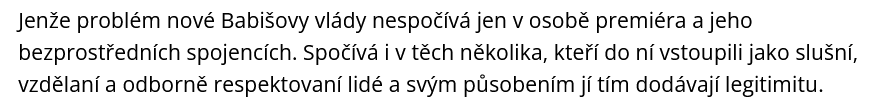Jestli si ale „Česko B“ ve spolupráci s mudrlanty na sociální síti X myslí, že my ostatní nemáme právo se ozvat, že nemáme právo kritizovat, nebo že nebudeme nazývat věci pravými jmény, tak to se šeredně pletou. Babišova vláda, to je vláda lůzy. Je to opravdu definitivní potvrzení citátu, že „nakonec nám budou vládnout ti nejneschopnější z nás“. Každý jeden člen nově vzniklého kabinetu by stál za speciální rozbor, v civilizované zemi by ale na úřadu vlády ani neotvíral dveře. To už jsme však řekli mnohokrát.
