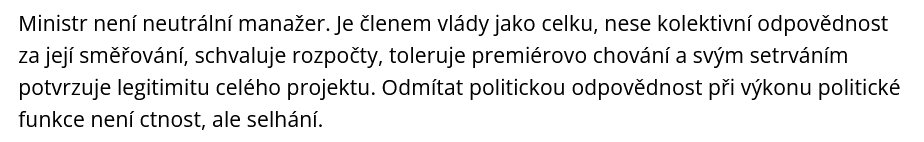 Jejich selhání je paradoxní právě proto, že nejsou nejhoršími členy vlády. U hulváta očekáváme hulvátství, u populisty cynismus. U slušného člověka očekáváme hranici, za kterou už nepůjde. A tím, že ji nepoložili, přispěli k erozi politické kultury možná víc než ti, kteří jí otevřeně pohrdají.