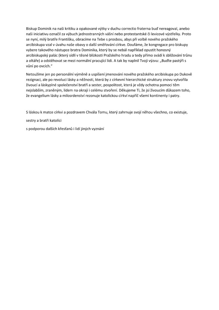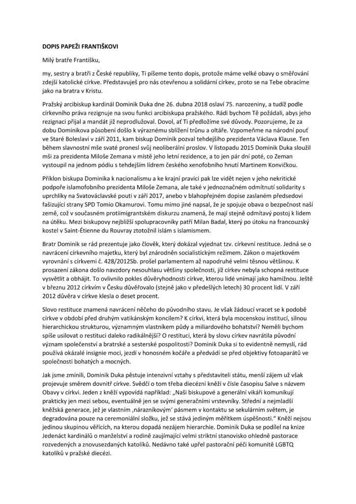 „Papeži Františkovi píšeme o tom, že nás trápí nacionalistické, až nahnědlé směřování české katolické církve pod vedením pana kardinála Duky – jeho snaha o obnovu jednoty trůnu a oltáře, podpora některých pravicových populistů – prezidenta Zemana nebo Tomia Okamury, dříve Václava Klause,“ sdělil v rozhovoru pro server Lidovky.cz Bierhanzl….Nesouhlasíme také s celkovým někdy až papalášským stylem, jakým pan kardinál vykonává svůj úřad – připomeňme „reklamu“ na Škodu Superb. Co nám naopak u vrcholných představitelů české církve chybí, jsou témata, která do globální církve vnáší papež František: důraz na ekologii a na nezastupitelnou roli církve v otázce sociálních práv všech lidí..“ celý článek na Lidovky.cz ZDE.