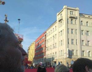 Demonstranti v úvodu akce drželi minutu ticha za zesnulého spisovatele a bývalého politického vězně Jiřího Stránského a také za oběti masakru na náměstí Nebeského klidu..“