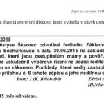 Důvodem k odvolání paní Sochůrkové z místa ředitelky ve Škvorci byl zápis Školské rady ze dne 1.6.2015, v němž jsou uvedeny důvody pro dlouhodobou nespokojenost s prací ředitelky školy a zahájení šetření České školní inspekce.