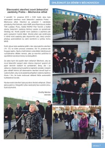 Součástí lednového Života Běchovic jsou aktuální jízdní řády na Kolín a na Beroun, což považujeme za velký bonus pro čtenáře – však je také hlavním tématem čísla otevření nové železniční zastávky Praha- Běchovice střed. Druhým bonusem jsou slevové kupony na čtyři obědy do restaurace Kudy Kam ( na str. 22). A třetím? přece tradiční fotogalerie „momentek“ starosty Martana ( ODS), v tomto čísle napočítno 11 ks :-)
