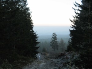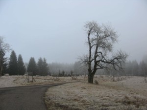 Odtamtud jsme před polednem vyrazili do liduprázdné krajiny pospávající pod inversním mlžným oparem. Po asfaltu jsme se přes vesnice Cheznovice, Těně a Strašice dostali na hranici vojenského újezdu Brdy. V posledně jmenované vesnici jsme doplnili zásoby tekutin. U vstupu do – v minulosti nepřístupného – prostoru bylo na stromech připevněno několik nových turistických značek. Prostor se má v dohledné době asi skutečně otevřít veřejnosti. Nicméně to, co lidi – jako my dva – v tomto prostoru láká, jsou právě ony neznačené cesty, u nichž není jasno, kam vedou. Jeli jsme tedy štrekou, kterou jsem v předchozích letech několikrát projel. Kolem loveckého zámečku Tři Trubky k zamrzlým Padrťským Rybníkům a pak do krpálu na druhý největší vrch Brd, na kótu Praha 856 m. Od nádraží v Mýtě jsme tak překonali 400 metrů převýšení. Pak jsme jeli ojíněným tichým lesem přes Borskou louku na svah pod nejvyšší vrch Brd – Tok. Bylo už hodně hodin, takže návštěvu vrcholu Brd jsme museli oželet. V samotném vojenském prostoru jsme zaregistrovali asi pět pěších turistů a kupodivu i dva otužilé cyklisty jakož i jednoho trénujícího běžce. Jinak tam byl jen tichý, jinovatkou pokrytý les. Návrat zpět do civilisace byl několikakilometrovým rychlým sjezdem přes několik „ztracených“ vesnic do Hořovic a po silnici do Zdic. Z vánočně vyzdobených Zdic jsme po cyklostezce dojeli až k nádraží Beroun. Vyhřátou nádražní halu s dovírajícími dveřmi jsme vnímali skoro jako „teplo domova“. Bořek, který do Berouna přijel po svých a „po Brdech“ měl v nohou celkem něco kolem 120 km, jel domů vlakem. Já jsem si v nádražní hale dal velký koláč z otevřeného kiosku a dvě kávy z automatu, což mě zvedlo. I řekl jsem si, že za momentálního bezvětří a za příjemných tří stupňů pod nulou by bylo hřích jet do Prahy vlakem. Tak jsem se na zpáteční cestu se zapnutým silným cyklosvětlem tichým večerem vydal po známé příberounské cyklostezce vedoucí kolem Karlštejna přes Radotín do Prahy. Do Radotína jsem jel takříkajíc „v pohodě“, jakkoli tento slovní obrat nemám rád. Poslední kilometry jsem však sotva plandal nohama. Prvně v tomto roce jsem do cíle dojížděl se silami „na doraz“. Kolem půl jedenácté večer jsem byl po nějakých 120-ti kilometrech na Smíchově u metra a energeticky na dně. Bylo to krásné a bylo toho víc než dost.