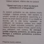 V sobotu 7.10.2017 se komorní vernisáží otevřela krásná výstava dobových pohlednic a fotek Újezda nad Lesy a okolí. Mozaiku obrázků, dýchajících lehkou nostalgií z plynutí času, je nejlepší prohlédnout si přímo v Újezdském muzeu v přízemí DDM na hlavní křižovatce v Újezdě nad Lesy. Fotky a pohlednice doprovázejí texty, které nás vrátí nejen o staletí do minulosti, ale třeba „jen“ do vzpomínek starousedlíků. Základem výstavy jsou sbírky pana Bartejse a pana Prokiše, kurátorkou je paní Marie Tomaidesová. Výstavu můžete navštívit vždy v sobotu mezi 13 a 17 h, prodloužena je do 19.11.2017. Nenechte si ji ujít!