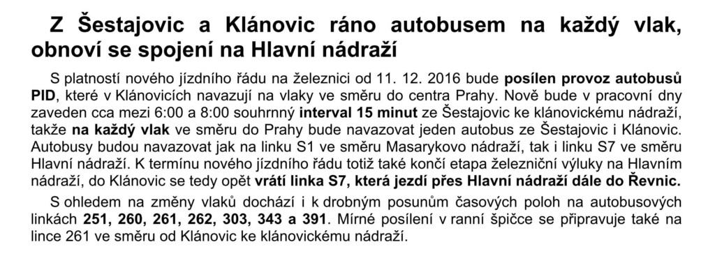 Ze Šestajovic busem 303 ke každému vlaku do Prahy ve špičce, obnovení vlakového spojení na Hlavní nádraží – od 11.12.2016