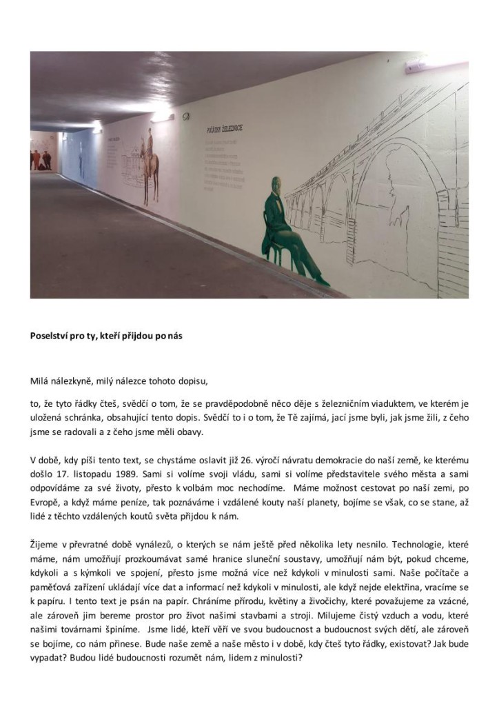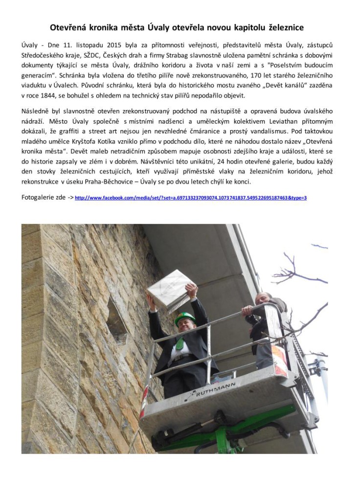 „Dne 11. listopadu 2015 byla za přítomnosti veřejnosti, představitelů města Úvaly, zástupců Středočeského kraje, SŽDC, Českých drah a firmy Strabag slavnostně uložena pamětní schránka s dobovými dokumenty týkající se města Úvaly, drážního koridoru a života v naší zemi a s „Poselstvím budoucím generacím“. Schránka byla vložena do třetího pilíře nově zrekonstruovaného, 170 let starého železničního viaduktu v Úvalech. Původní schránku, která byla do historického mostu zvaného „Devět kanálů“ zazděna v roce 1844, se bohužel s ohledem na technický stav pilířů nepodařilo objevit. Následně byl slavnostně otevřen zrekonstruovaný podchod na nástupiště a opravená budova úvalského nádraží. Město Úvaly společně s místními nadšenci a uměleckým kolektivem Leviathan přítomným dokázali, že graffiti a street art nejsou jen nevzhledné čmáranice a prostý vandalismus. Pod taktovkou mladého umělce Kryštofa Kotíka vzniklo přímo v podchodu dílo, které ne náhodou dostalo název „Otevřená kronika města“. Devět maleb netradičním způsobem mapuje osobnosti zdejšího kraje a události, které se do historie zapsaly ve zlém i v dobrém. Návštěvníci této unikátní, 24 hodin otevřené galerie, budou každý den stovky železničních cestujících, kteří využívají příměstské vlaky na železničním koridoru, jehož rekonstrukce v úseku Praha-Běchovice – Úvaly se po dvou letech chýlí ke konci.“
