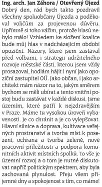 Připadá mi proto nejzajímavější, zda jsou jejich názory a postoje konsistentní. To neznamená neměnné! ale ubírající se stejným směrem, rozvíjející základní myšlenku či ideál, doplněný znalostí řešení.  Možná, že všichni zastupitelé zveřejňují a archivují své sloupky, svoji práci a své názory na webových stránkách svých politických stran a uskupení. Že to dělají zastupitelé Otevřeného Újezda, si mohou čtenáři ověřit od r. 2010, kdy Otevřený Újezd poprvé vstoupil na újezdskou komunální scénu. V období 2010 – 2014 měl v zastupitelstvu MČ P21 tři mandáty, stejně jako nyní.
