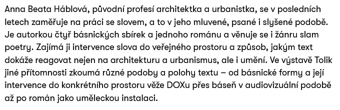 Ve výstavě Tolik jiné přítomnosti se ve třech patrech věže Centra DOX setkává malba Patrika Hábla s literaturou a poezií Anny Beaty Háblové.