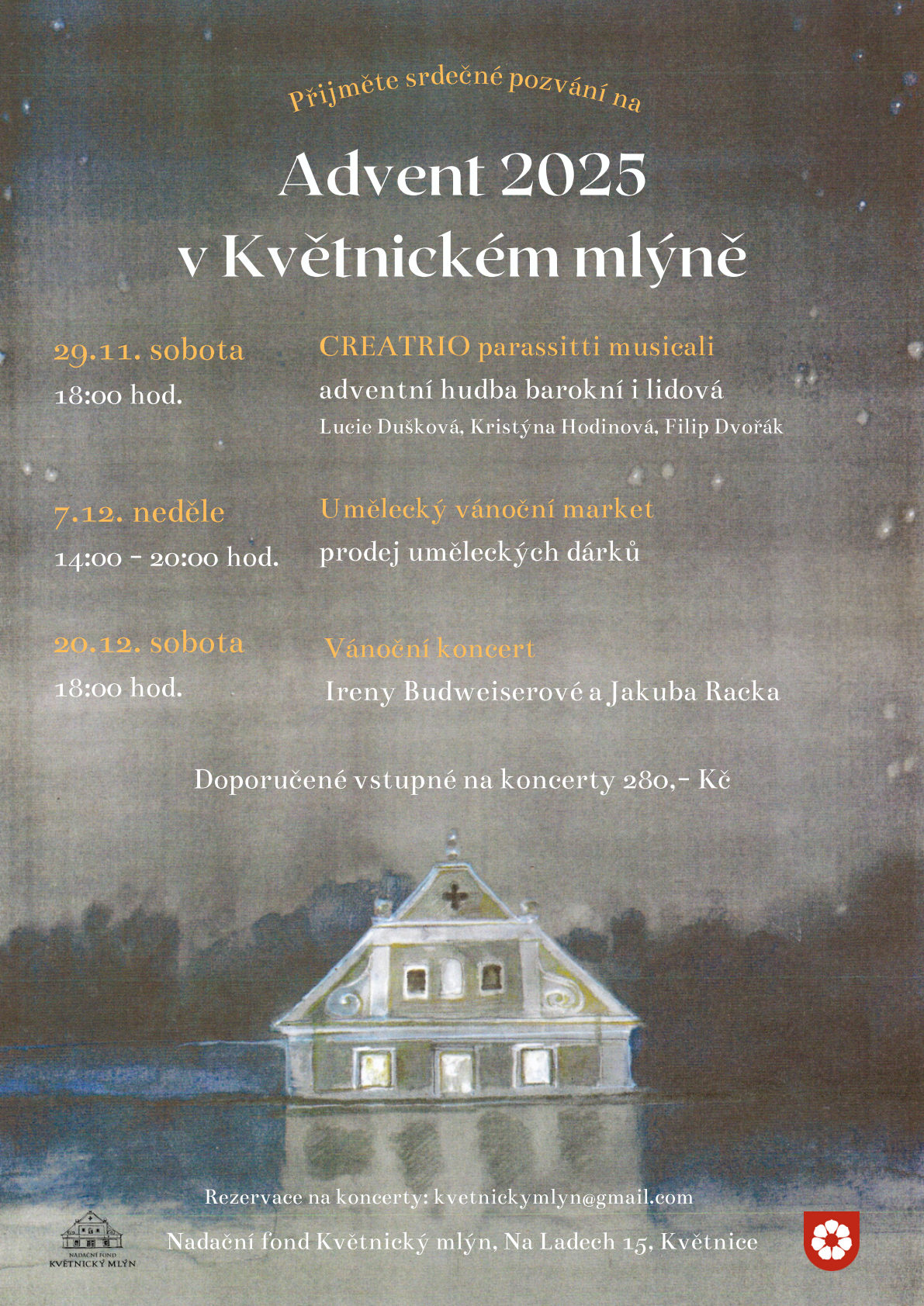 Pozvání do Květnického mlýna na adventní koncerty a jarmark. Od 29. listopadu do 20. prosince 2025