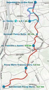 „Trasa je navržena tak, že její převážná část prochází zelenými oddychovými zónami a jen zbylé menší úseky jsou vedeny pražskými ulicemi. Vzhledem k tomu, že na hlavní trase jsou bohužel dvě poměrně ostrá stoupání a troje schody, připravili jsme pro poutníky se sníženou pohyblivostí a pro rodiny s malými dětmi dvě kratší speciální „kočárkové“ trasy vedoucí od kostela sv. Václava v Nuslích (3 nebo 4,5 km). Přesné časy odchodů, detailní mapu ke stažení a další podrobnosti najdete na zvláštní stránce pouti ZDE.“