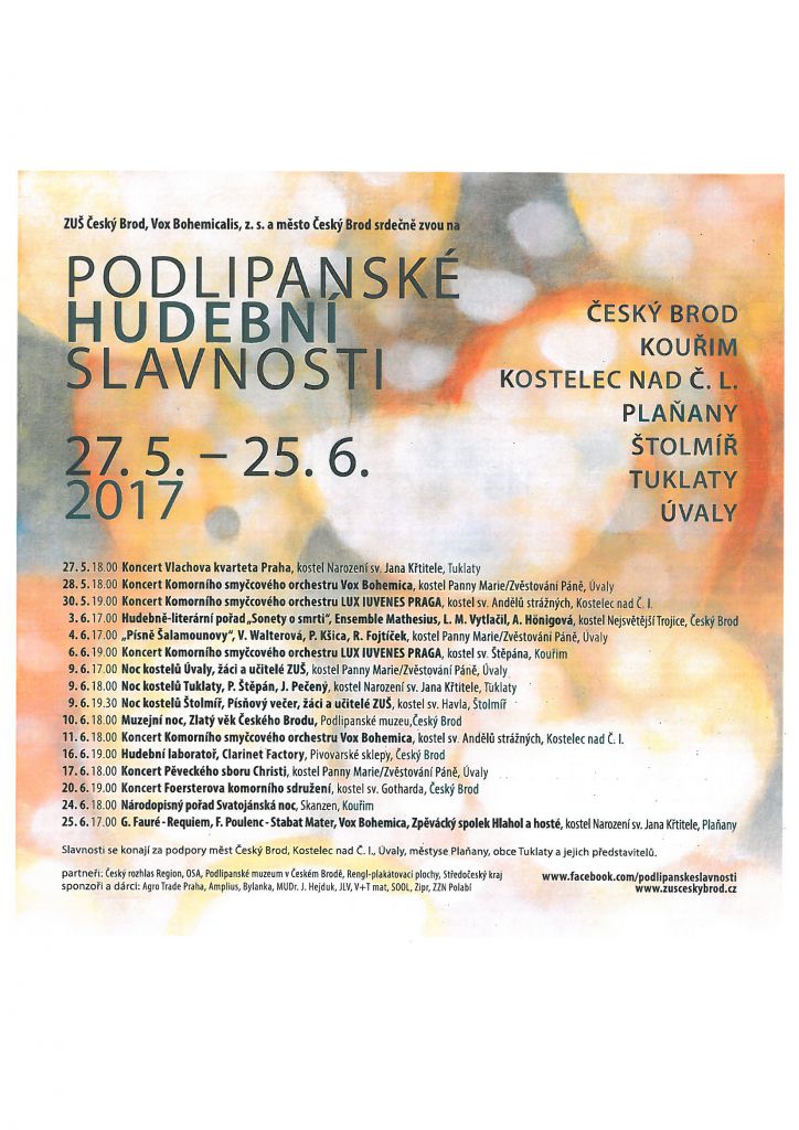 Nenechte si ujít krásné předletní koncerty v našem okolí. Podlipanské hudební slavnosti sice už začaly, ale koncerty v sousedních obcích a městech můžete navštěvovat až do 25.6.2017. Tak vybírejte!
