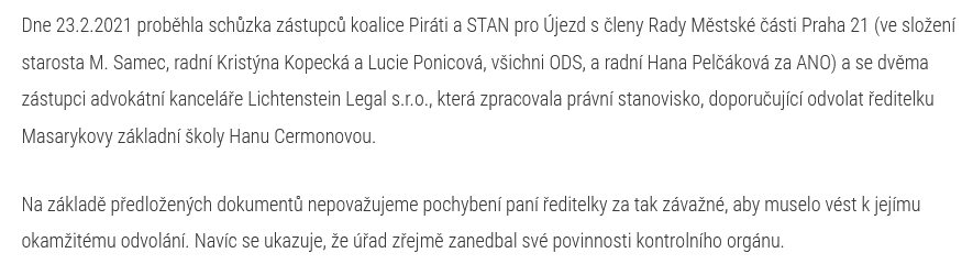 Ředitelka Masarykovy ZŠ v Újezdě nad Lesy, paní Mgr. Hana Cermonová, byla Radou MČ Praha 21 odvolána z funkce k 1. březnu 2021.