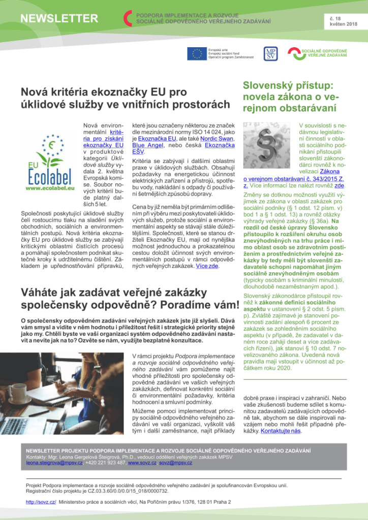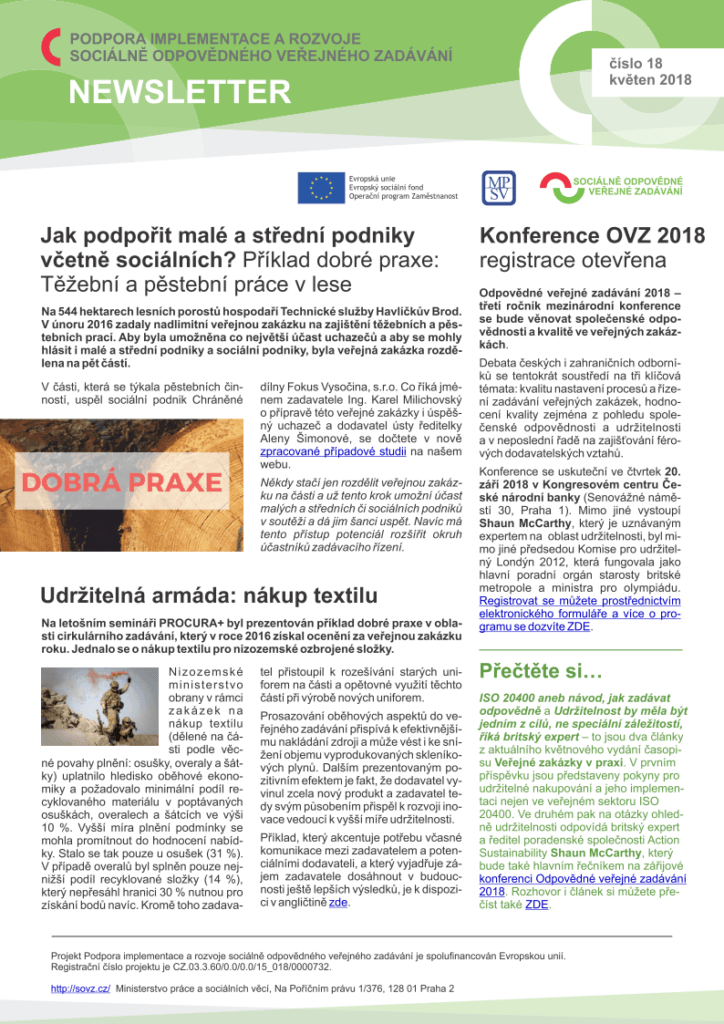 Květnové vydání newsletteru o rozvoji sociálně odpovědného veřejného zadávání (OVZ) v České republice a EU a informace o spuštění registrací na konferenci Odpovědné veřejné zadávání 2018. „Letošní ročník se uskuteční 20. září, v Kongresovém centru ČNB. Minulý rok se na všechny zájemce o účast nedostalo, proto doporučujeme se registrovat včas.“