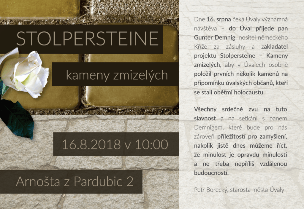 Pozvání do Úval na slavnost položení „Kamenů zmizelých“ za oběti holocaustu ve čtvrtek 16.8.2018. AKTUALIZACE
