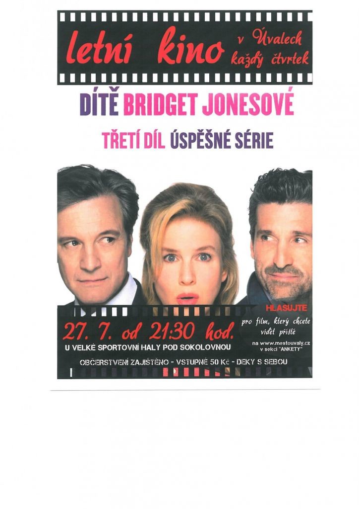 Ve čtvrtek 27.7. od 21.30 hodin promítá Letní kino Úvaly film "Dítě Bridget Jonesové". Místo konání: Hřiště pod sokolovnou, 25082…