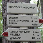 Z lomů jsem jel na modrou a po ní a po několika metrech asfaltu jsem byl u rozcestníku Boubová zase na červené. Nádherná lesní cesta vedla po vrstevnici k Bubovickým Vodopádům, které se ukázaly taky jako zážitek. Voda v nich prakticky nebyla, ale přes (díkybohu suché) kaskády bylo nutné brašnami vybavené těžké kolo přenášet. Proti mně šla zespoda skupina asi 20 třicetiletých turistů. Ti s provokativními hláškami sledovali můj sestup s kolem z nejvyššího bodu, křičeli něco o Šemíkovi a vyzývali mě ke skoku s kolem. Nakonec mi mladí zatleskali, což jsem jako důchodce ocenil. Nicméně kolo jsem musel s temným klením i potom dál snášet, vynášet a přes lávky přenášet ještě na několika místech, už bez potlesku.