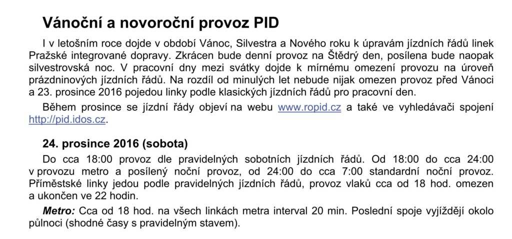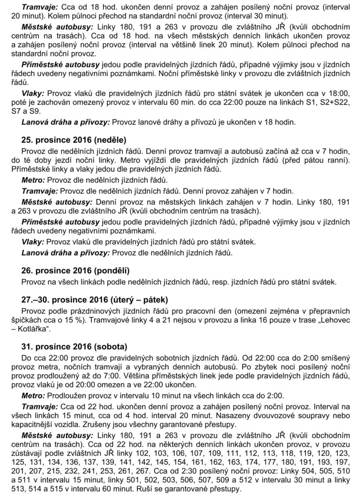 Vánoční a novoroční provoz metra, tramvají, busů, vlaků, lanovky a přívozů: 24.12.2016 – 2.1.2017