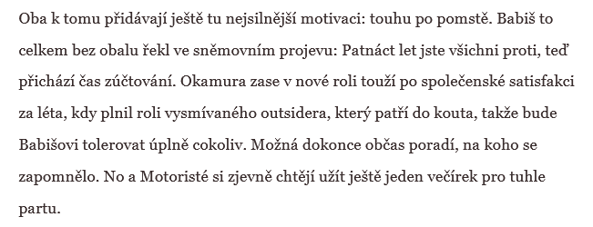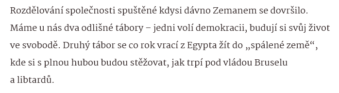 Moc přebírá spojenectví, v němž mohou všichni zúčastnění ukázat to nejhorší, co se v nich skrývá, aniž by se museli obávat, že by je někdo korigoval. Tady je povoleno jet na plný plyn a každý si ve vzájemném objetí může řešit to, co ho zrovna aktuálně nejvíc zajímá: Babiš budoucnost svého byznysu, Okamura totéž, jen v menším.