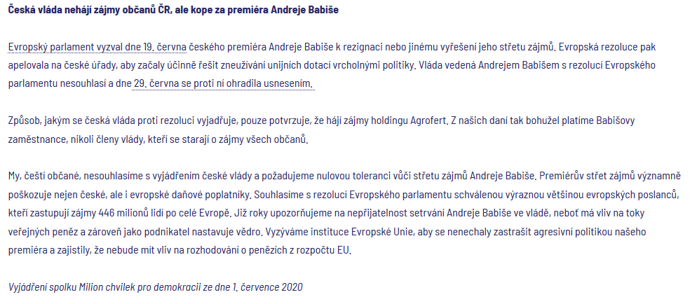 Protože zásadně nesouhlasíme s vyjádřením české vlády, vydali jsme oficiální prohlášení, ve kterém požadujeme nulovou toleranci ke střetu zájmů Andreje Babiše. Toto prohlášení jsme přeložili do třech světových jazyků a budeme ho jménem spolku Milion chvilek šířit i v zahraničí.