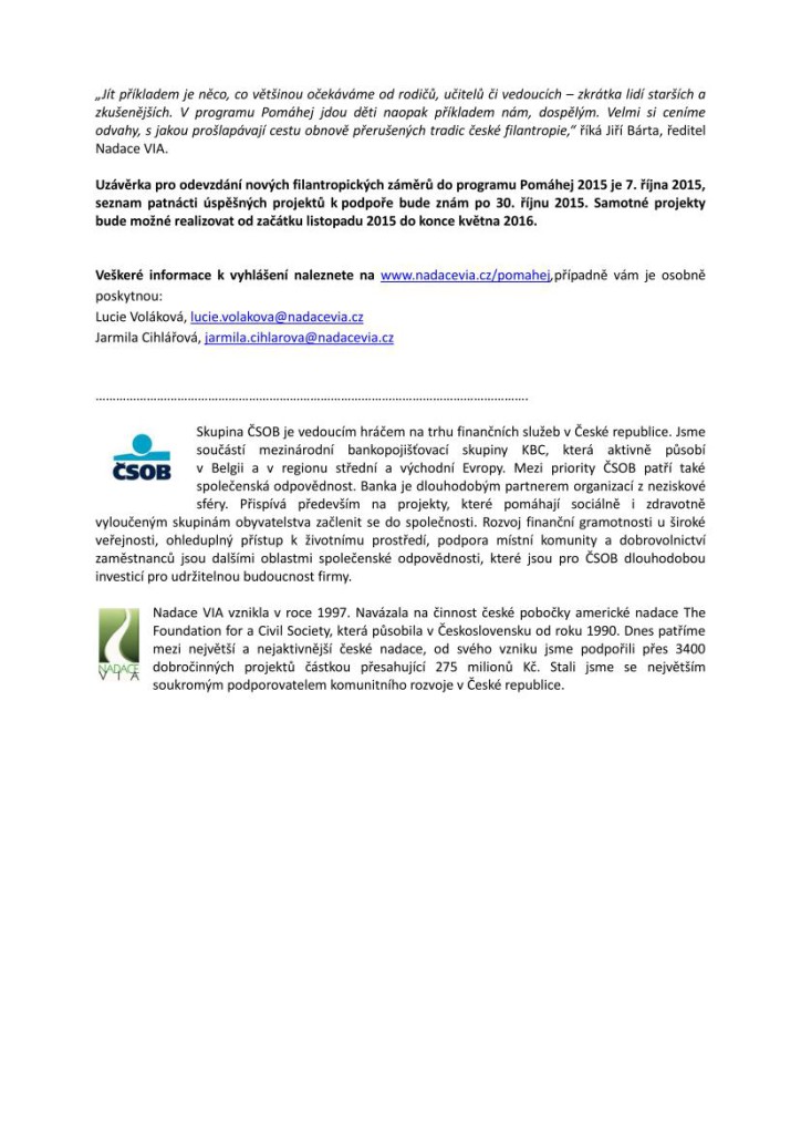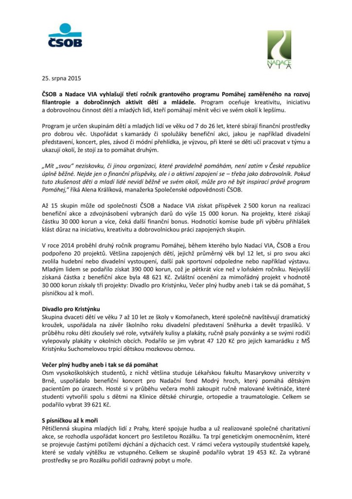 Nadace VIA a ČSOB vyhlásily 3. ročník programu Pomáhej zaměřeného na rozvoj filantropických aktivit dětí a mládeže. Cílem programu je podpořit benefiční akce pořádané skupinami dětí a mladých lidí, kteří vybírají finanční prostředky pro dobrou věc.