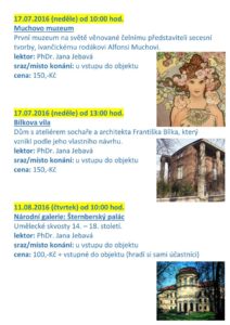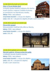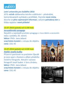 Program pátého ročníku kulturní Letní univerzity pro každého, kterou pořádá agentura JABATO a PhDr. Jana Jebavá, hostující lektorka Újezdské univerzity volného času, zahrnuje přednášky, komentované vycházky a prohlídky po Praze během července a srpna. Prázdniny se dají prožít s kulturou, kterou máme pod nosem. Tak neváhejte!